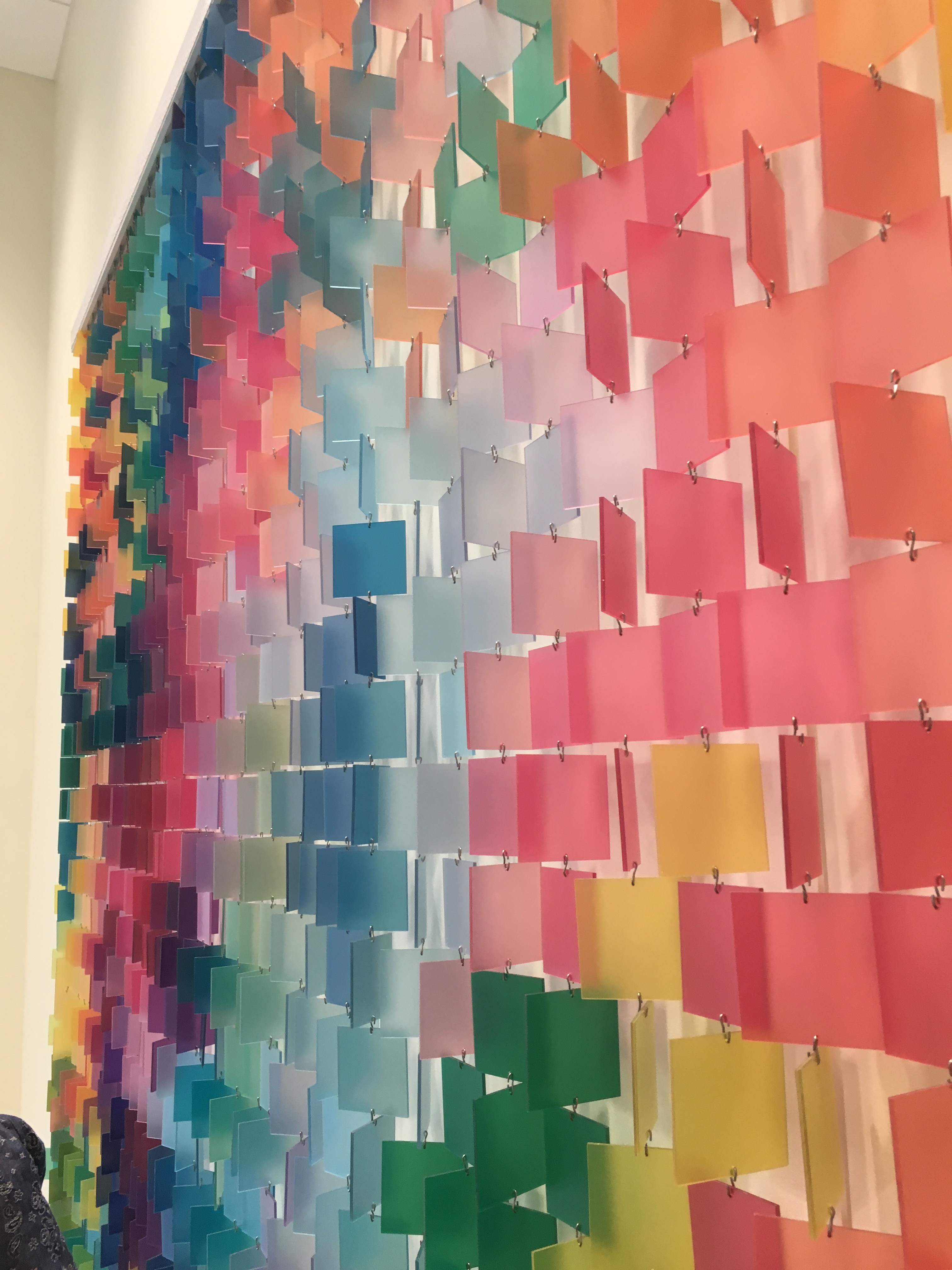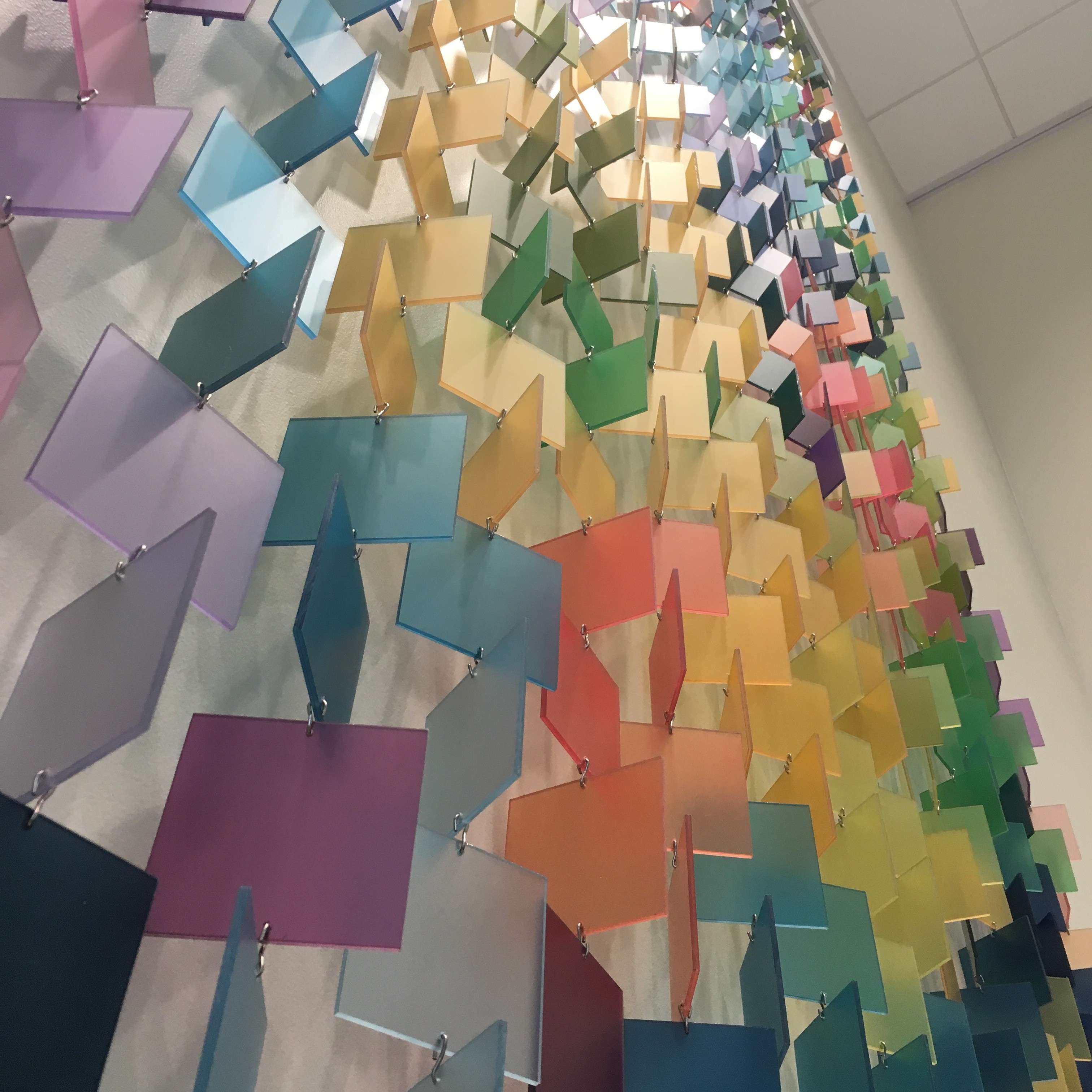 The vibrant, shifting surface of "Vera Chroma 12-22-03" creates a sense of uplift and quiet possibility. Hundreds of transparent squares form a cascading field of color—an abstract expression of healing, transformation, and peace. Each square is precisely angled, catching light differently throughout the day. As the natural exterior light changes, so does the work itself, offering viewers a dynamic, ever-evolving experience.
