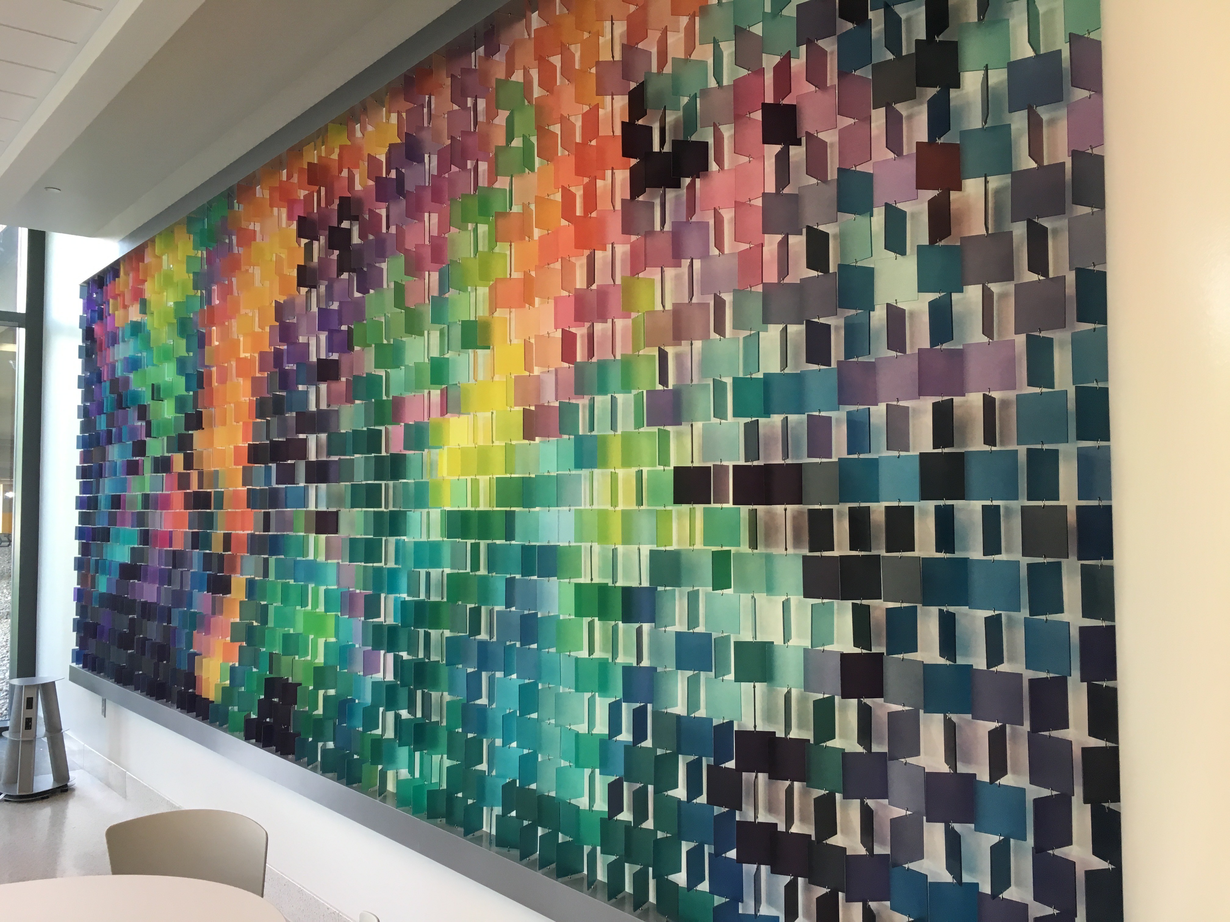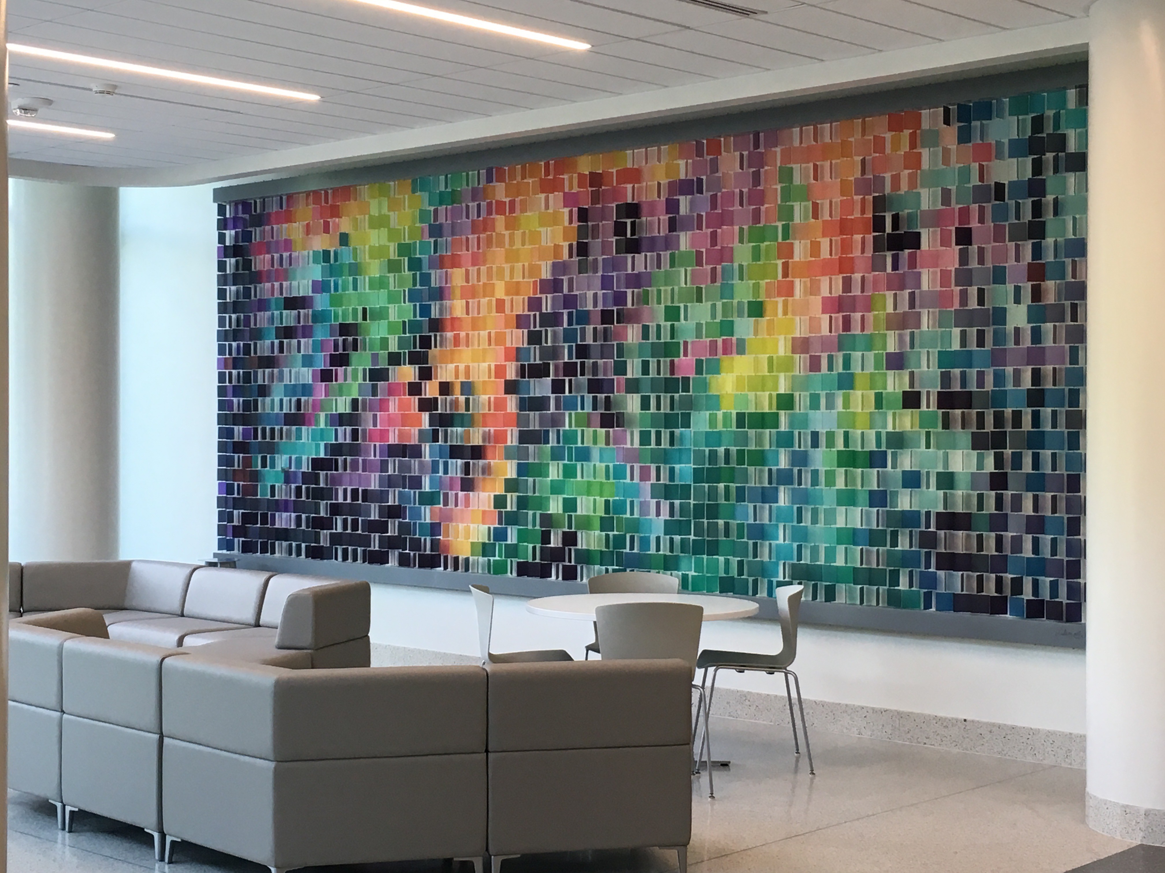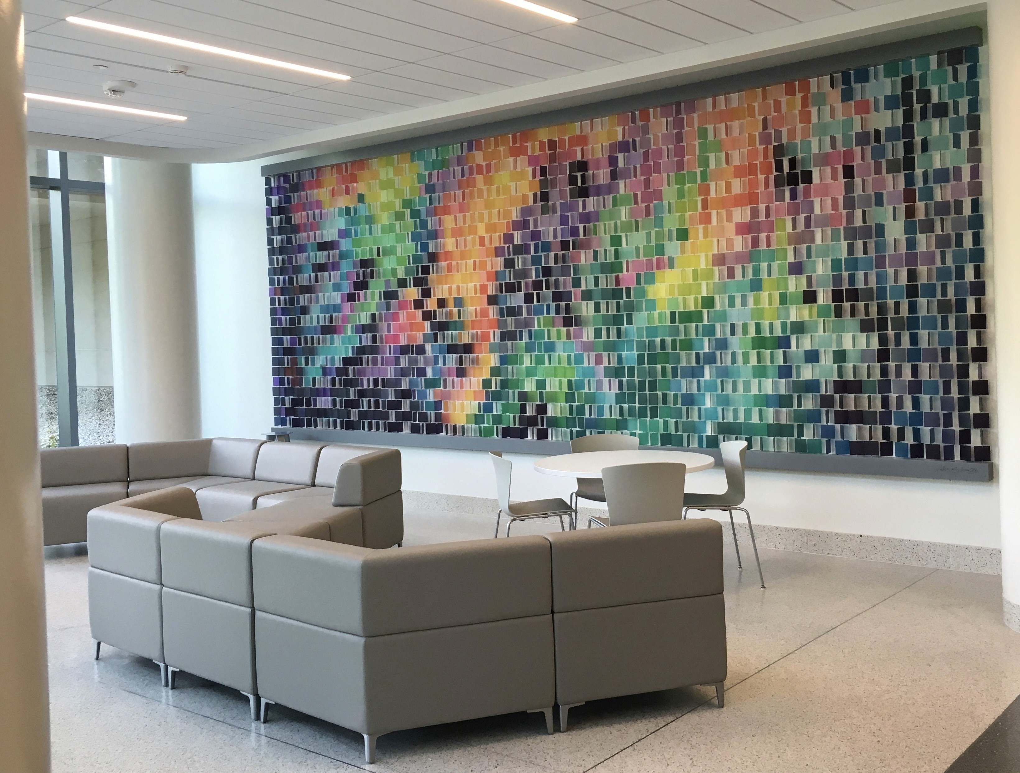 Vitality offers a moment of pause and reflection in a place defined by movement and intensity. Made of hundreds of transparent architectural resin squares, the piece greets visitors with a shifting field of color.
