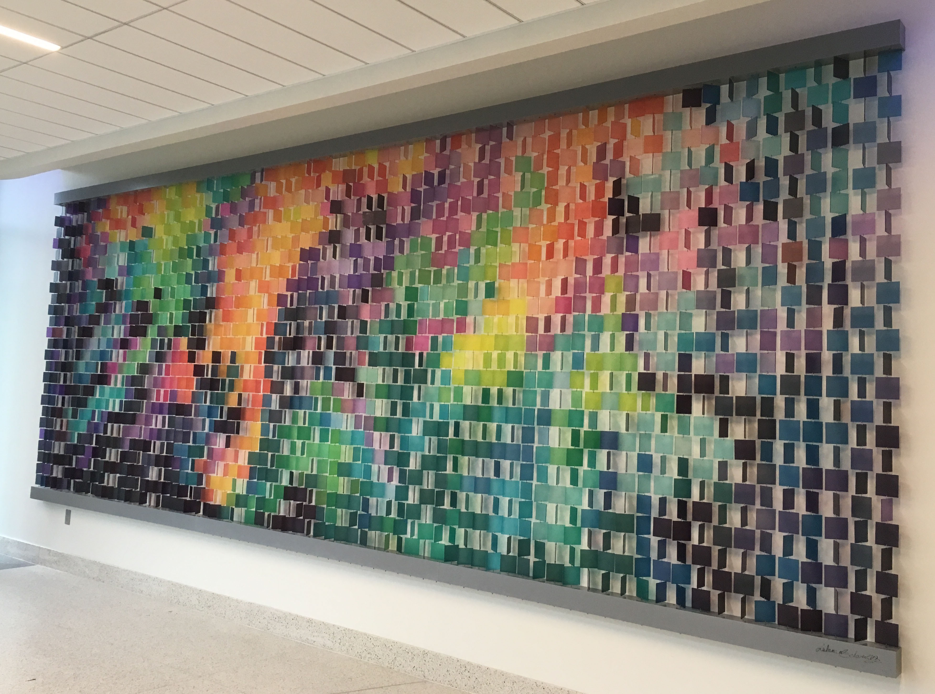 The resin squares creates a changing composition with every shift of light and every step a viewer takes. Transparency allows colors to deepen, overlap, and dissolve into one another. No two views are the same; each encounter offers a fresh composition.